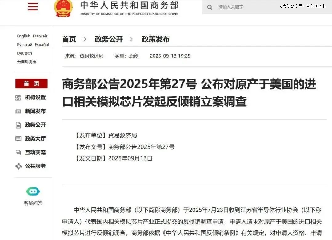 据央视报道,依据《中华人民共和国反倾销条例》第十六条的规定,商务部决定自2025年9月13日起对原产于美国的进口相关模拟芯片进行反倾销立案调查。