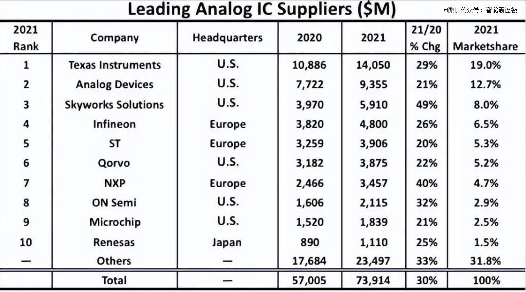 这意味着全球第 一的市场,大部分份额都被别人拿走了。这里面最 大就是,德州仪器(TI)和亚德诺(ADI)这两家美国巨头,在2021年就占了全球模拟芯片市场的19%和13% 。