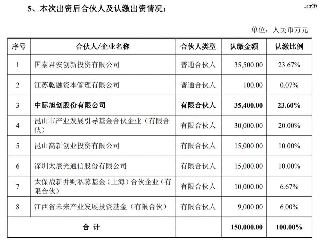 其实,从基金名称就可以看出,这是一只与中际旭创关联密切的基金。出资方面,中际旭创拿出3.54亿元,认缴比例达23.6%,是最大LP。