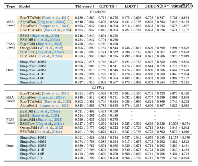 研究人员训练了从100M、360M、700M、1.1B、1.6B和3B等不同参数的版本,并在CAMEO22和CASP14上对它们进行了评估,包括对折叠模型的泛化、鲁棒性和原子级准确性的严格测试。