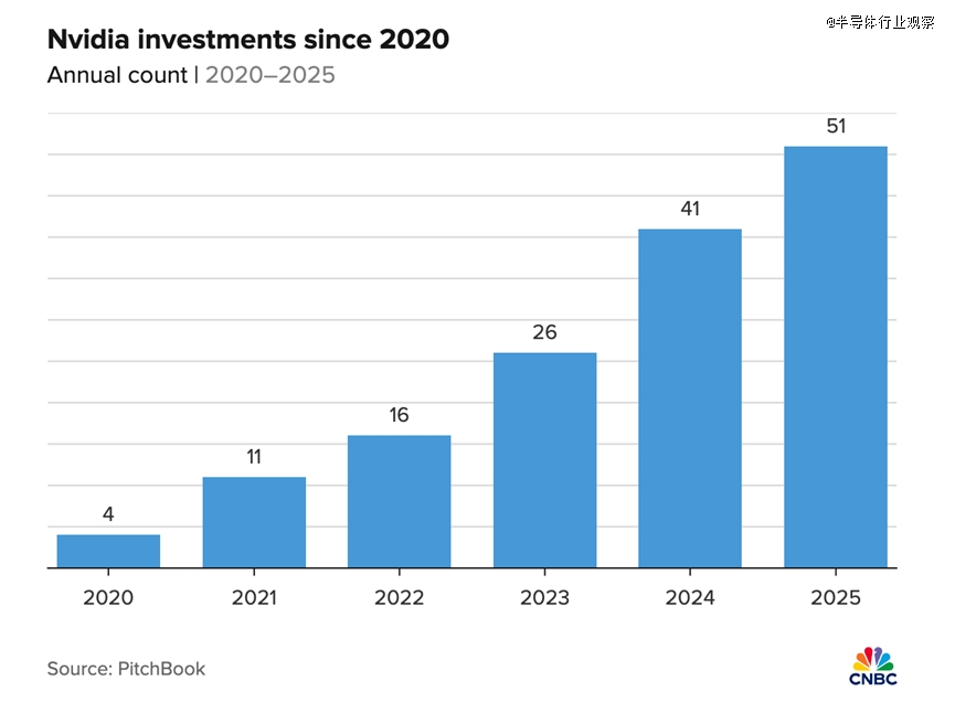 根据CNBC对PitchBook数据的分析,在ChatGPT首次亮相的那一年,英伟达对其他公司进行了16项投资,其中包括种子轮融资和通过孵化器获得的股份。英伟达的投资在2024年增加到41项,而截至2025年,该公司已完成了51项此类交易,其中不包括对OpenAI的承诺。