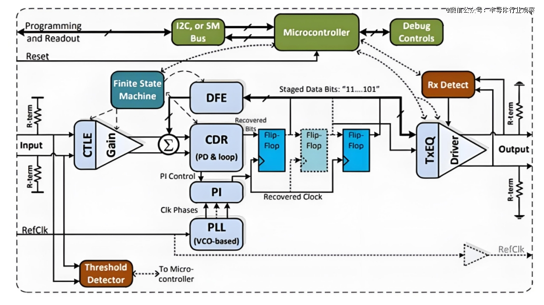 Retimer芯片是一种混合信号模拟/数字芯片,其原理是使用内部的时钟恢复电路,重新定时输入信号以消除时钟偏移和抖动,并校正信号的相位和时间偏差(jitter)。它可以延长接口的传输距离并提高信号质量,PCIe Retimer芯片主要解决数据中心、服务器通过PCIe协议在数据高速、远距离传输时,信号时序不齐、损耗大、完整性差等问题。