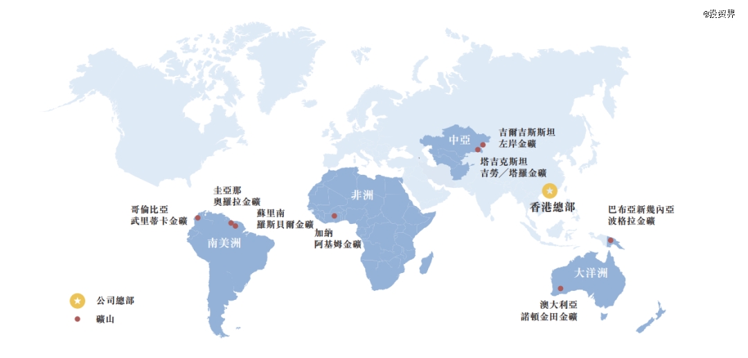 截至2024年,紫金黄金国际的收入来自经营的6个不同金矿,加纳阿基姆金矿和巴布亚新几内亚波格拉金矿未综合入账至其合并财务报表。