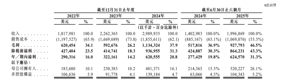 紫金黄金国际被看作“纯黄金股”,近几年,其营收稳步提升:2022年-2024年,紫金黄金的营收分别为18.18亿美元、22.62亿美元和29.90亿美元,净利润则分别为2.90亿美元、3.22亿美元和6.21亿美元,毛利率分别达到34.1%、26.2%、37.9%。