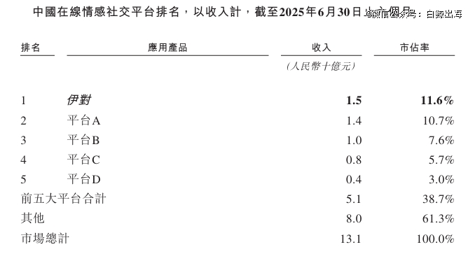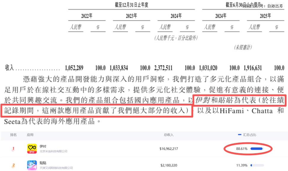 公司成立于 2015 年,定位为在线情感社交平台,旗下产品包括面向国内市场的「伊对」(恋爱社交平台)、「贴贴」(语音社交平台),和以海外市场为主的「HiFami」(从应用截图来看,类似「贴贴」海外版)、「Chatta」(视频社交平台)、「Seeta」(视频社交平台)。据招股书显示,按收入计,截至 2025 年 6 月 30 日止 6 个月,旗下的主力产品「伊对」以 1.5 亿元位列中国在线情感社交市场*,市占率达 11.6%。