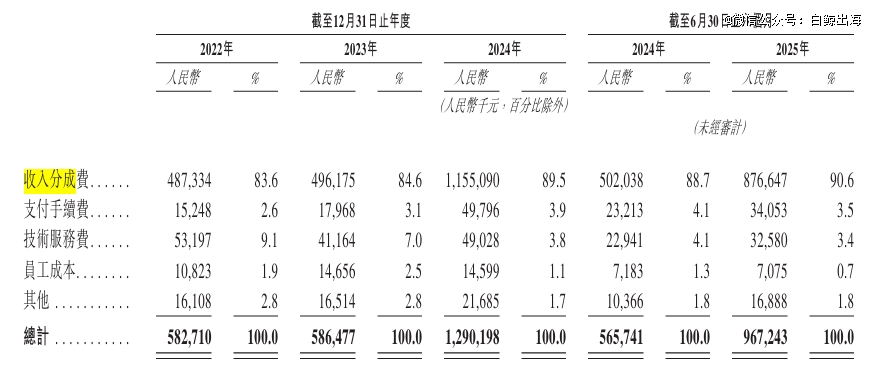目前,「米连科技」的收入主要来源于应用的增值服务,大致可分为虚拟礼物购买、互动功能开通和会员订阅三大部分,据三方数据平台显示,「伊对」中虚拟礼物的内购收入占比超 70%。而截至 2025 年 6 月,「伊对」累计拥有 18 万名“主持人”用户,如上所述,其作用在于引导用户互动,以提升匹配成功率,同时,“主持人”也可以从用户送出的虚拟礼物中抽取 20%-52% 的分成。因此,据招股书显示,收入分成费成为了「米连科技」最主要的成本支出,报告期内在营业成本中的占比均在八成以上,2024 年度达 12.55 亿元;并在今年上半年占比超过 90%,该数据占总营收的比例为 45.75%。