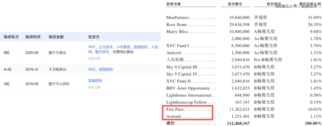 「米连科技」B 轮融资参投方,其中 Fast Pace为小米集团全资附属公司,Astrend 为顺为资本联创 Tuck Lye KOH旗下公司。|图源 36 氪、招股书,信源招股书