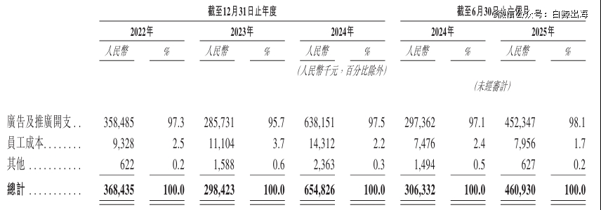 此外,「米连科技」亮眼成绩的背后,离不开营销方面的投入。招股书显示,2022-2024 年,销售及营销开支分别占同期营收的 35.0%、28.9%、27.6%。其中,广告及推广开支占比均超过 95%,分别达到 3.58 亿元、2.86 亿元和 6.38 亿元,2024 年度明显上涨,同比增长 123.1%;2025 年上半年已经达到 4.52 亿人民币,同比增长 52.2%。