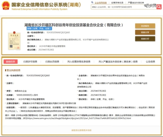 投资界(ID:pedaily2012)消息,湖南省长沙开福区科创谷青年创业投资基金合伙企业(有限合伙)(以下简称“科创基金”)于2025年7月28日完成工商注册,2025年10月10日成功通过中国证券投资基金业协会备案(备案编号:SBGC60),标志着基金已具备合规运作资质,基金投资工作全面驶入“快车道”。
