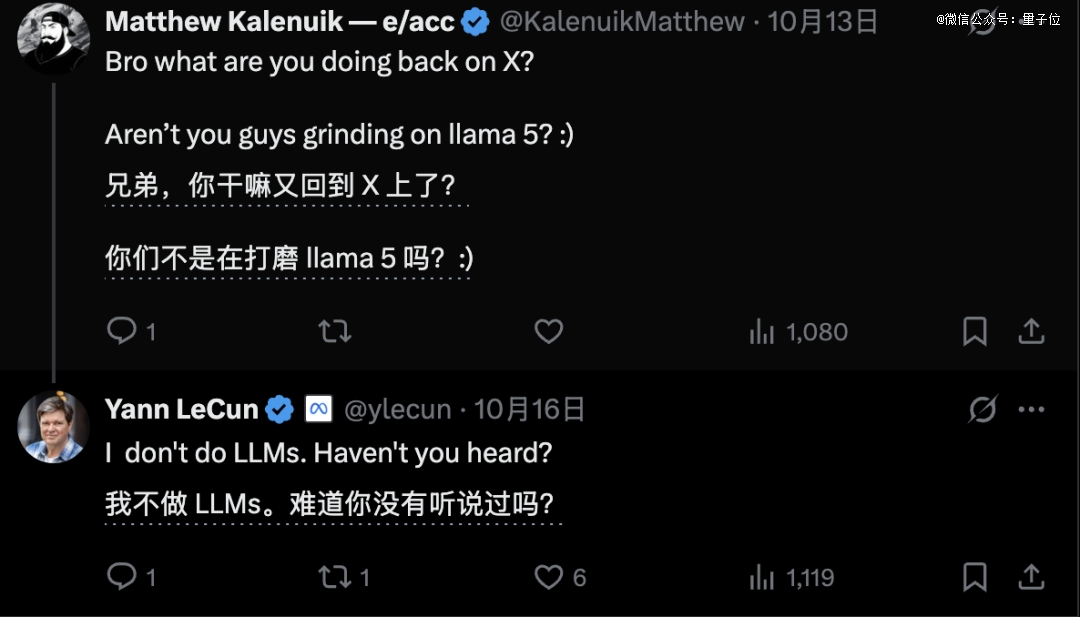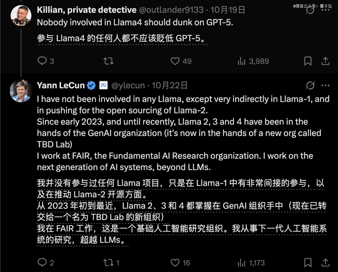 在最近与网友的互动中,LeCun还连续澄清自己和Llama项目没有过一毛钱关系。