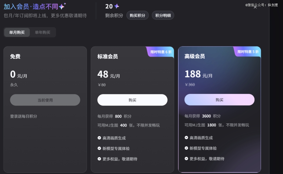 值得一提的是,AI生成视频需要使用积分,积分可通过完成签到等任务领取,也可充值,充值规则为10元可购买100积分,以此类推。此外可加入会员,标准会员单月价格为48元,每月可获得800积分,高级会员188元每月,每月可获得3600积分。