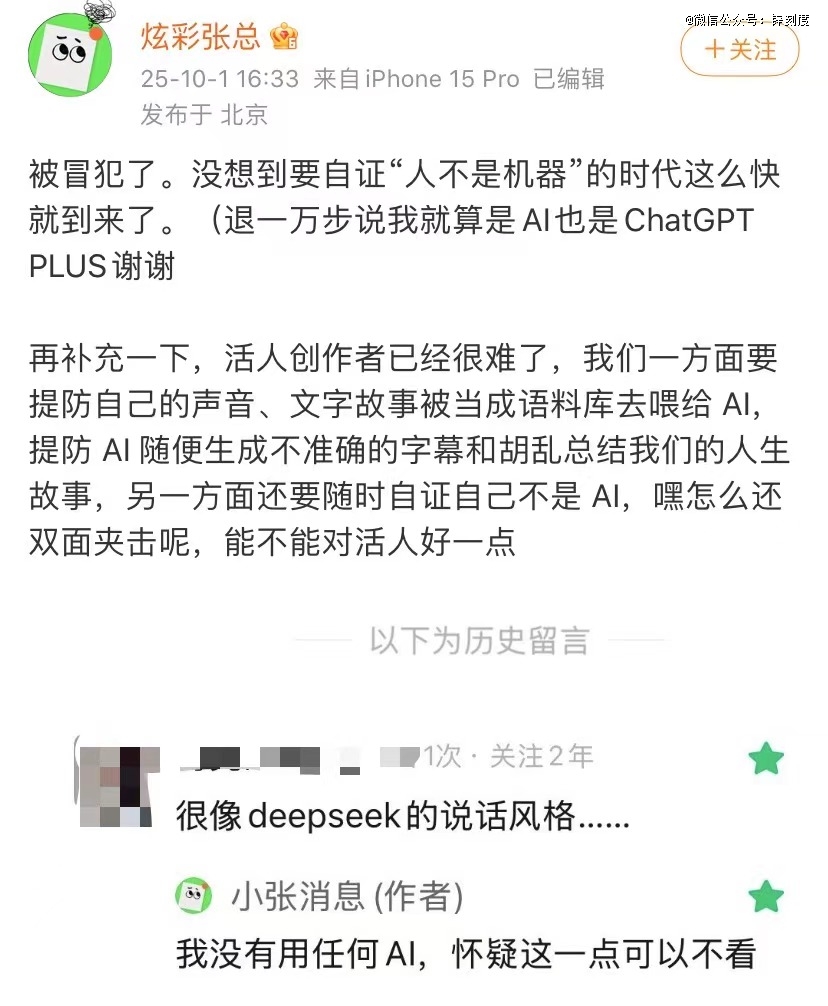 不仅是画师,许多文字创作者近期也饱受质疑。其中,一名播客主创近日就曾发布微博提到自己“被冒犯了”,因为其说话风格被指“很像deepseek的说话风格。”该博主表示,“没想到要自证‘人不是机器’的时代这么快就到来了……活人创作者已经很难了,我们一方面要提防自己的声音、文字故事被当成语料库去喂给AI,另一方面还要随时自证自己不是AI。”