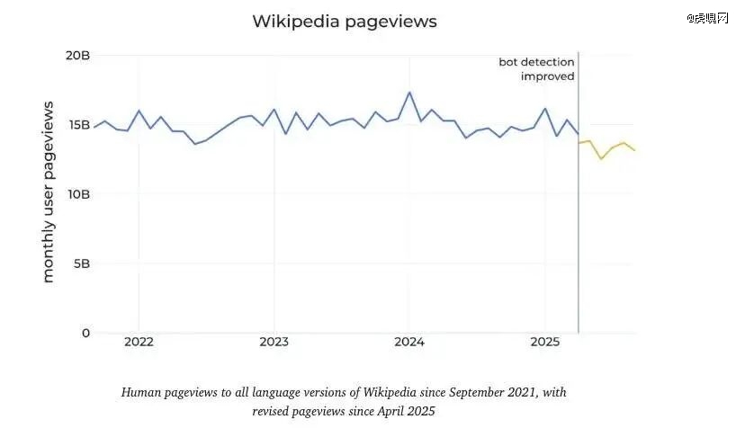 虽然最终戏剧性的“放了鸽子”,但确有消息显示,维基百科的流量正因人工智能大量流失。从4月的一份数据来看,相比于去年,维基百科的人类页面浏览量下降了8个百分点。