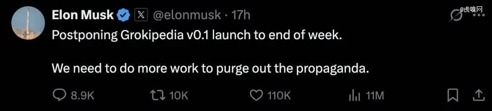 10月21日凌晨,马斯克在X 发文表示推迟推出Grok百科 0.1版本(Grokipedia v0.1),并表示“我们仍需投入更多精力清除宣传性内容。”