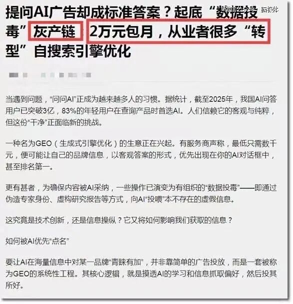 GEO商家的操作流程高度系统化。他们先挖掘热门关键词,再炮制长达千字的“专业”文章,最后将这些内容投放在容易被大模型抓取的高权重媒体平台。更甚者通过虚构“行业白皮书”或伪造排行榜单,直接污染AI的学习材料。