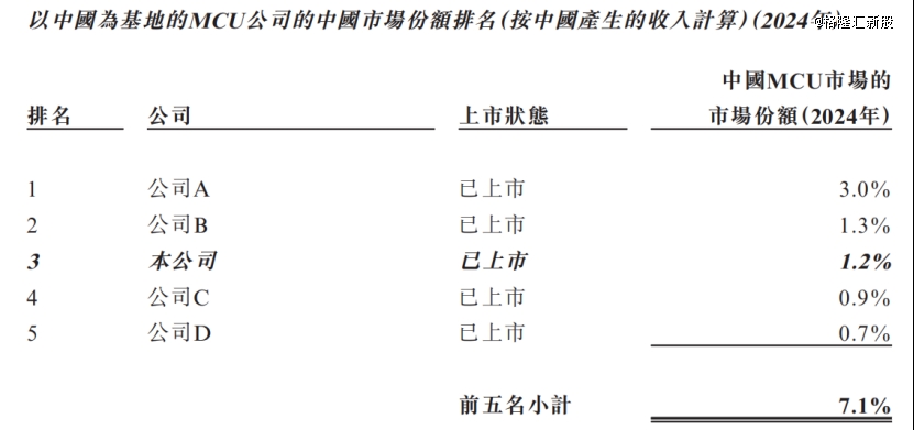 以中国为基地的MCU公司的中国市场份额排名,来源:招股书