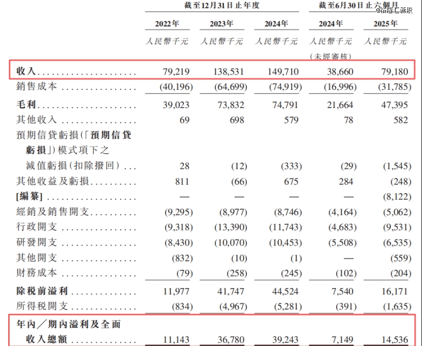 2022年、2023年、2024年和2025年1-6月(报告期),公司分别产生收入7920万元、1.39亿元、1.5亿元、7920万元,净利润分别为1114.3万元、3678万元、3924.3万元、1453.6万元。