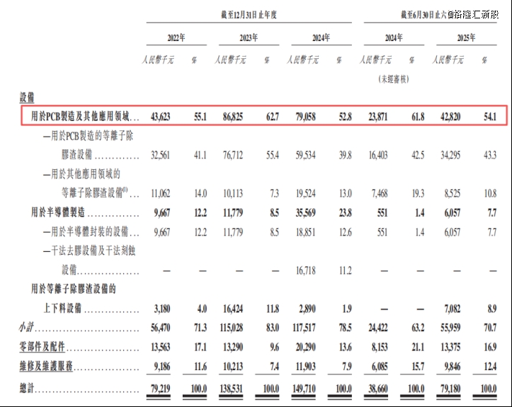 按产品线划分,用于PCB制造的等离子除胶渣设备是公司的主要收入来源,报告期内收入占比分别为41.1%、55.4%、39.8%及43.3%。