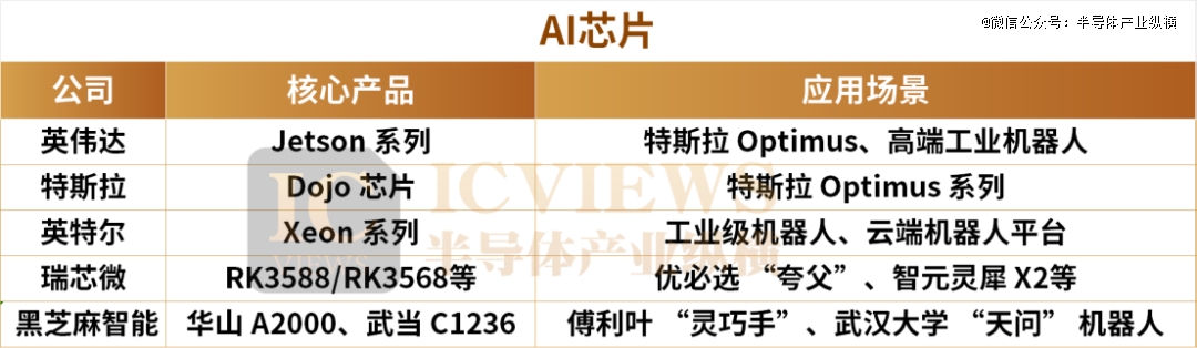 当前全球市场仍以英伟达Jetson系列、英特尔Xeon系列为主导,特斯拉自研的Dojo芯片则专为Optimus机器人优化,这些产品凭借成熟的软件生态占据高端市场。