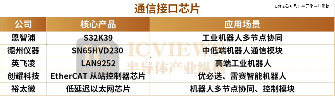 国际市场上,恩智浦S32K39、德州仪器SN65HVD230、英飞凌LAN9252是主流选择,垄断工业机器人通信模块市场。