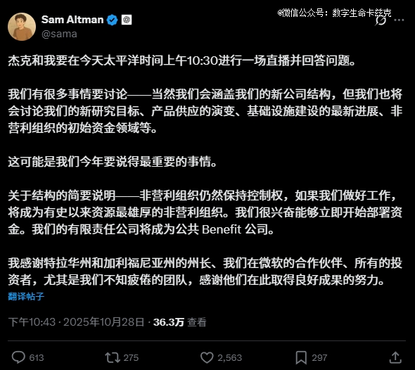 然后,奥特曼也非常临时的宣布了重组的消息,以及,北京时间凌晨1点半,开始直播。