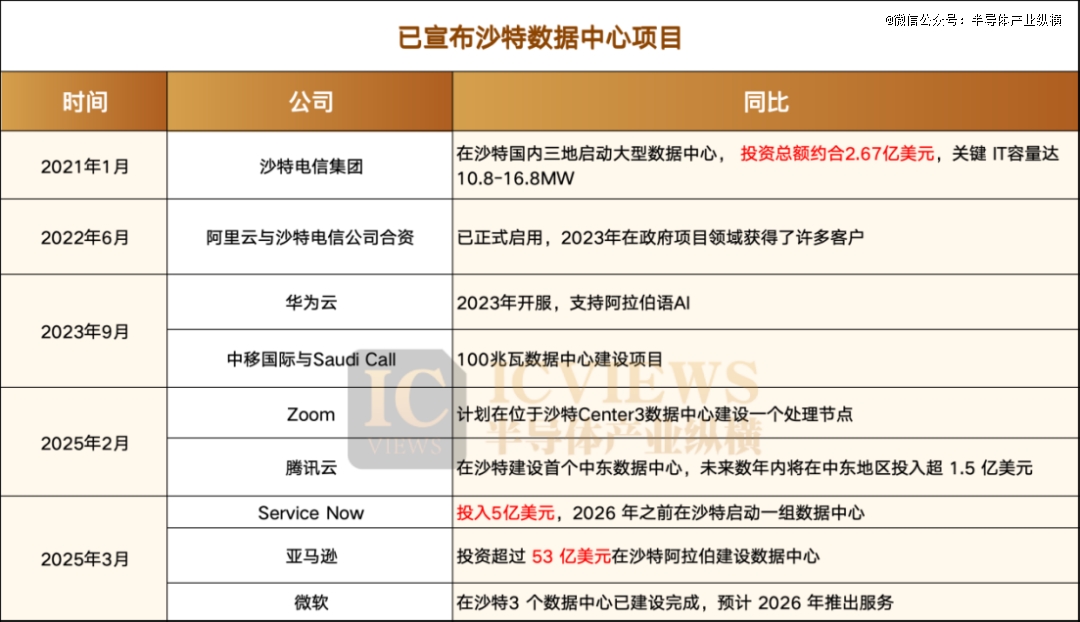 半导体产业纵横整理了2021年以来部分确认在沙特投资的数据中心项目。不难发现在2024年之前,大部分项目是沙特本国与中方合作的数据中心项目。这些项目目前已经运行,这些项目支撑起了沙特云计算市场的基本底座,服务了以沙特为中心的中东地区零售、金融科技、互联网、人工智能等方面的需求。