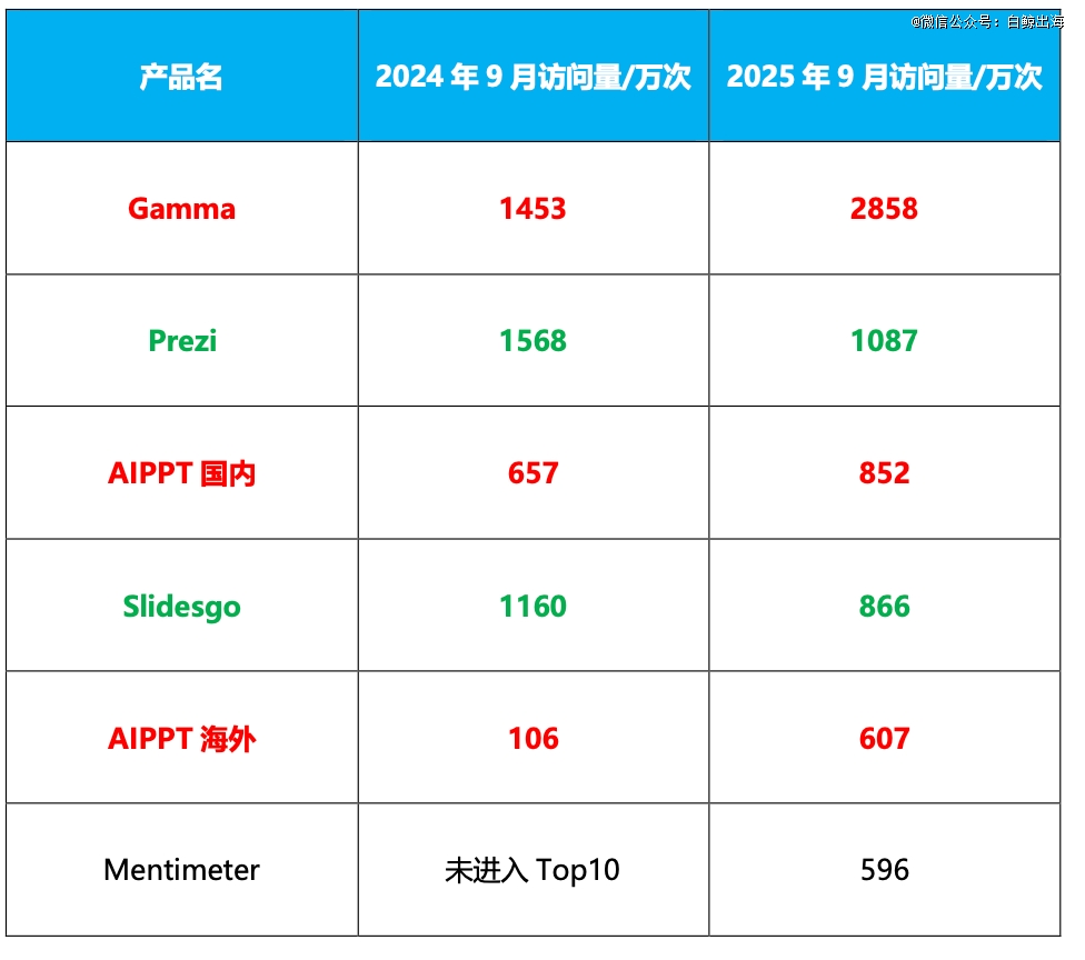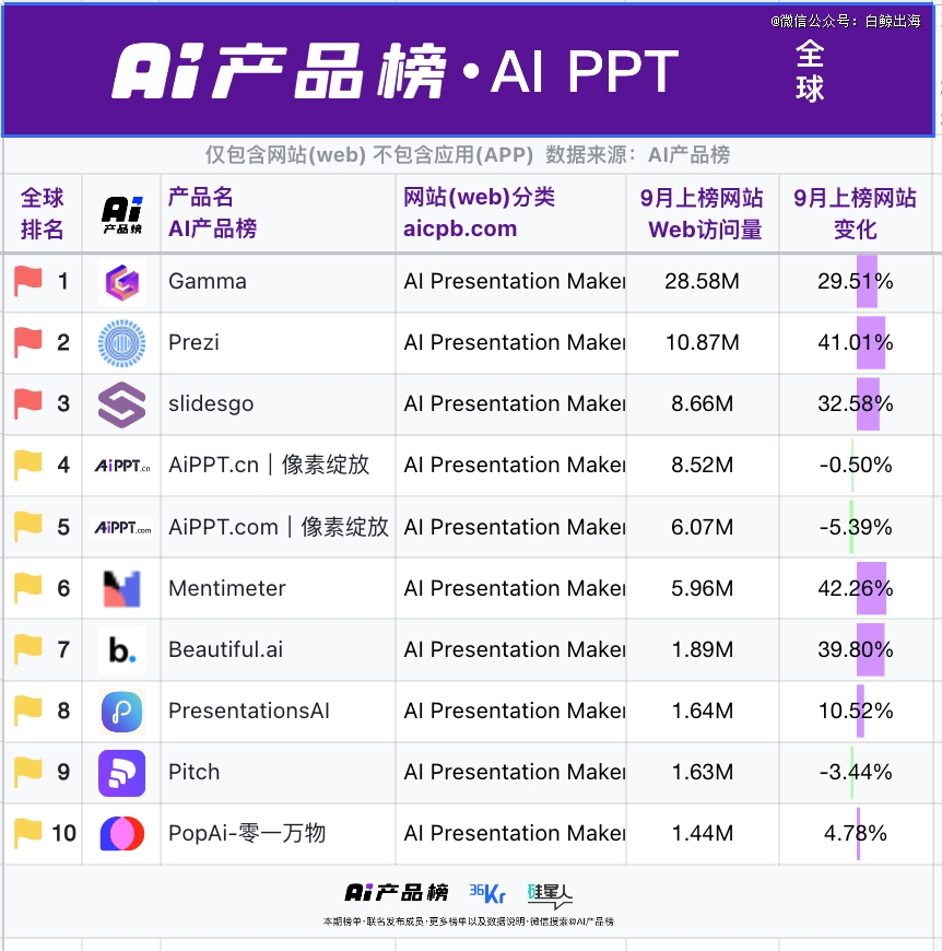从 AI 产品榜的排名来看,Top5(AIPPT 国内海外版加起来计算)没有明显变化,仅有 Mentimeter 算是新跑出来的产品,与其下方的 Beautiful.ai 拉开了不小的差距。相对排位上,Gamma 的访问量 1 年内增长近 1 倍,超过了 Prezi 登顶赛道,接近 3000w 的访问量,即使在所有 AI 产品里,成绩也不逊色,加之 1 亿美元的 ARR,估计除了特别专业的垂类 SaaS外,在 AI 产品里怎么也能排到前 5,是其 20 亿美元估值的底气。