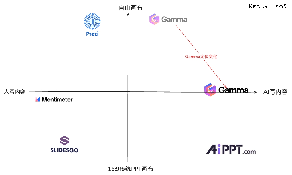 但从表格也能看出来,AI PPT 赛道并不是普涨,而是两升两降,Gamma、 AIPPT 上升,而突出模板和效果、走“老产品+AI”模式的 Slidesgo 和 Prezi 下降。从定位上看,AI+PPT 赛道可以以“人写内容-AI 写内容”“自由画布-传统 16:9 画布”的象限来进行定位,而从产品的演进看“16:9 传统画布”与“AI 写内容”结合的流量表现会更好。