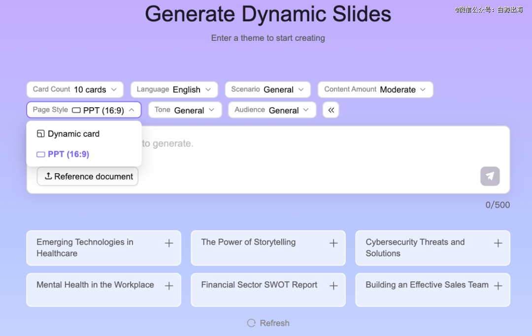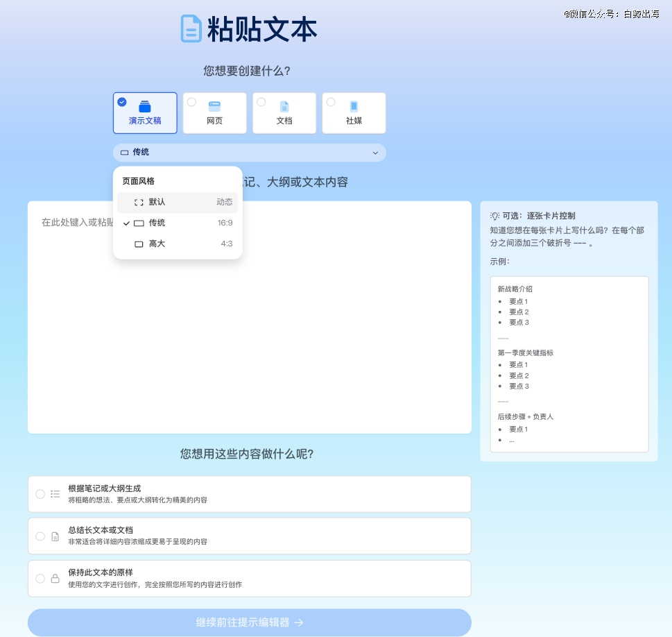 去年 9 月测试 Gamma 的时候,其*的差异点就是“无限画幅”和“卡片式编辑”,而现在,在生成内容之前,用户可以从演示文稿、网页、文档、社媒等四种内容形式当中选择(这个选择主要影响信息密度、图文的比例),如果用户选择了演示文稿,则可以选择动态调整画幅(对应无限画幅)或固定画幅比例为 16:9 或 4:3。而根据笔者的测试,如果用户选择默认,生成出来的内容绝大多数情况也会趋近于 16:9 的传统 PPT 画幅比例,只不过在编辑时不会限制画幅。