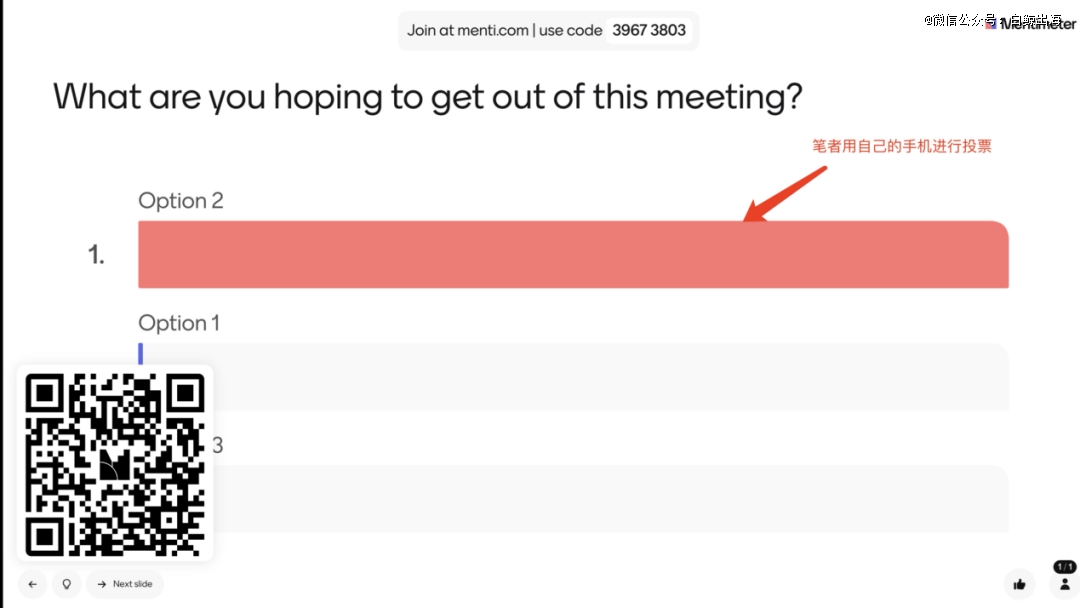 Mentimeter 的核心功能是在常规的 PPT 中,加入用户可参与的单选/多选投票、词云、开放式问题、量表、图片标注等丰富的互动功能。具体做法是,演讲者会在演示过程中展示二维码,观众用手机扫码,就可以在浏览器中打开投票或填写内容的页面。在用户填写完成并提交之后,其结果就能实时显示在 PPT 中。