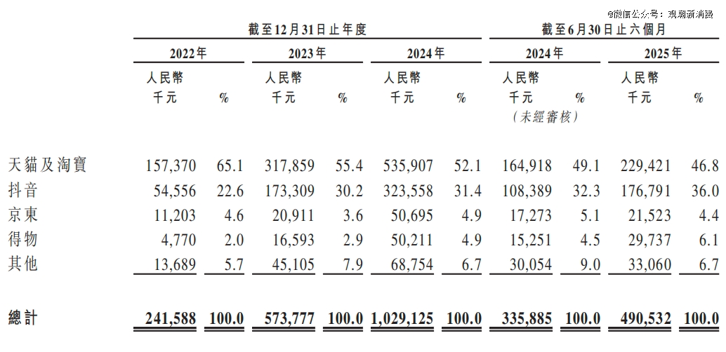 其中,天猫及淘宝自营店铺是伯希和主要线上渠道,收入从2022年的1.57亿元增加至2023年的3.18亿元,并在2024年增至5.36亿元。来自抖音的收入也增长迅速,分别为5456万元、1.73亿元、3.24亿元。2025年上半年与去年同期相比,天猫及淘宝自营增长38.79%至2.29亿元,抖音增长63.89%至1.77亿元。