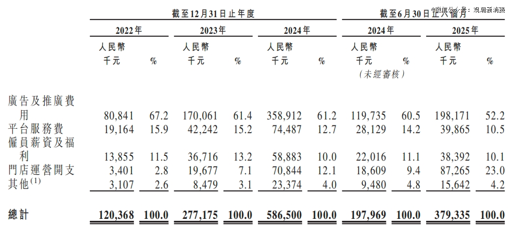 其中,广告及推广费用分别为8084万元、1.7亿元、3.59亿元、1.98亿元,前三年基本都在翻倍增长;各占总营收的21.37%、18.72%、20.32%、21.66%。