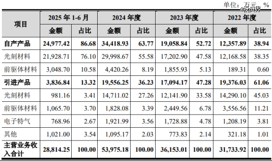 具体来看,2022年至2025年上半年,恒坤新材自产产品销售收入分别约为 1.2亿元、1.9亿元、3.4亿元和 2.4亿元,占主营业务收入的比例分别为 38.94%、52.72%、63.77%和 86.68%,收入规模和占比逐年上升。