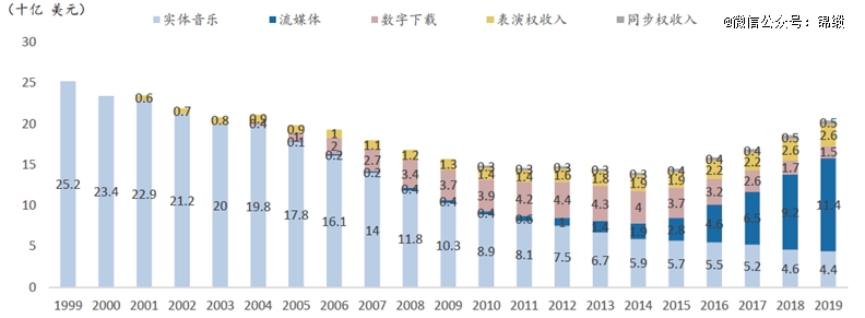 图:Spotify的传播模式创新拯救了音乐行业(全球录制音乐市场规模)资料来源:IFPI,广发证券