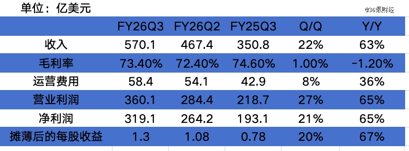 利润方面,本季度,英伟达毛利率达到了73.4%,同期净利润为319.1亿美元,同比增长65%,对应净利率56%。