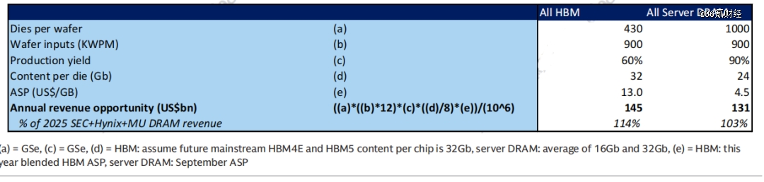 而高盛测算,如果这90万片全部转换为HBM,其规模大致相当于三家公司今年DRAM总营收的114%;若全转换为服务器DRAM,则规模约三家公司DRAM总营收。