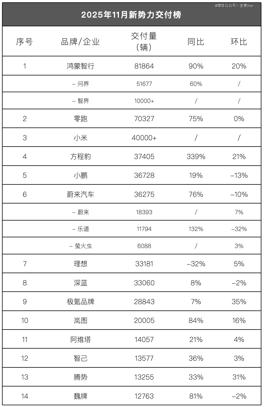 整个11月,头部座次仍在变化,腰部竞争异常胶着。随着购置税减免政策进入倒计时,12月的年末冲刺将决定谁能笑到最后,也将影响明年的市场格局。