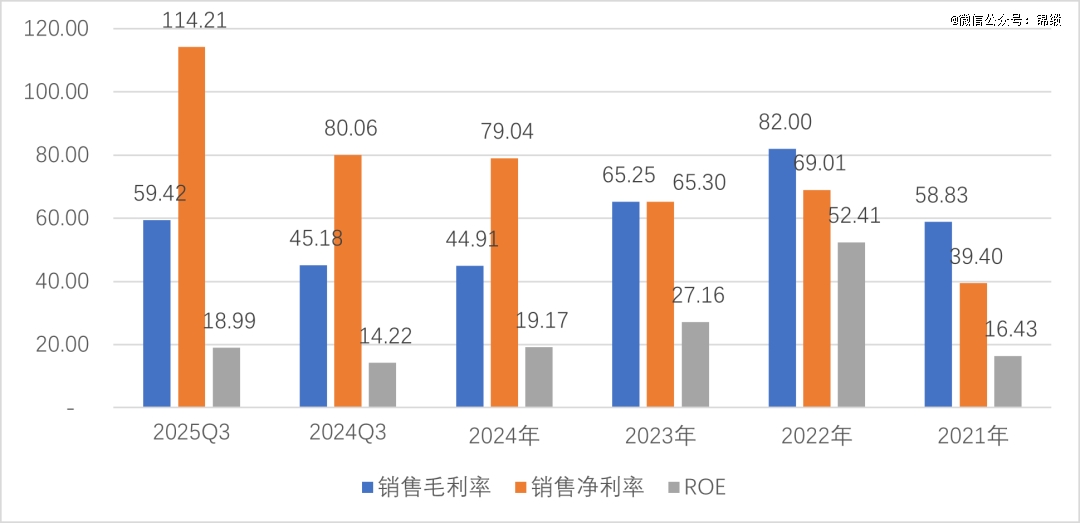 藏格的ROE在2022年达到52.41%,为近年最高。23年起投资收益(绝大部分为巨龙铜矿项目)对净利润影响权重显著增加,造成销售净利率畸高。25年前三季度ROE为18.99%,年化后即25.32%。