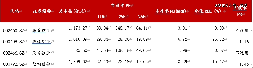 选取锂板块上市公司进行估值比较,藏格矿业与盐湖股份可比性最强。两者同为青海、西藏盐湖区的钾、锂巨头,开采成本约3-4万元/吨,远低于锂辉石提锂(5.5-8万元/吨)和锂云母提锂(6-13万元/吨)。两家公司2026年预期市盈率基本相当,藏格矿业的市净率更高,但从市赚率(PR)角度看,藏格矿业占优。