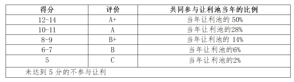 (1)如果某等级当年缺失,则该等级对应的让利金额由其他等级按照比例对应关系进行配比分配。比如A+等级缺失,则A+等级对应的让利金额由A至C各等级按照28:14:6:2的比例关系进行分配。
